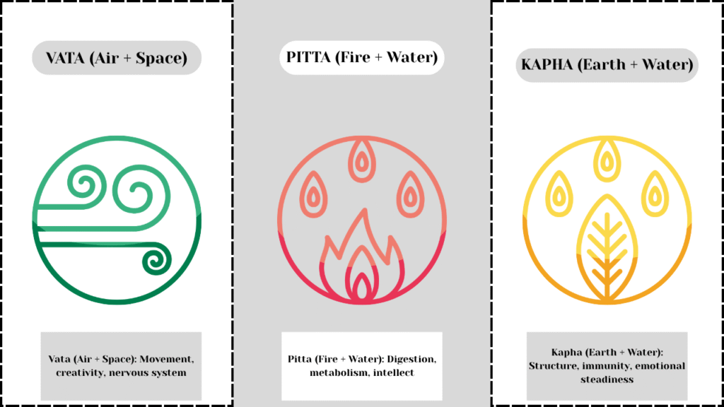 Whereas contemporary medicine tends to treat symptoms in isolation, Ayurveda considers health a subtle balance of energies. Central to this are the three doshas — Vata, Pitta, and Kapha — each of which is a combination of the five elements (earth, water, fire, air, ether).